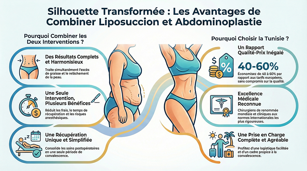 Cet article expose les bénéfices de coupler une liposuccion à une abdominoplastie pour obtenir une restructuration complète et harmonieuse de la silhouette. Cette approche intégrée permet d’éliminer les amas graisseux tout en corrigeant le relâchement cutané, offrant ainsi un résultat esthétique plus cohérent qu’une intervention isolée. L’article souligne également les avantages logistiques et sanitaires d’une telle combinaison, tels qu’une convalescence unique et une exposition réduite à l’anesthésie. La Tunisie est mise en avant comme une destination de choix pour ces soins, grâce à ses infrastructures modernes et ses tarifs compétitifs. Enfin, l’expertise de trois praticiens renommés, les docteurs Gam, Ben Salah et Abidi, illustre le haut niveau de compétence médicale disponible dans le pays.