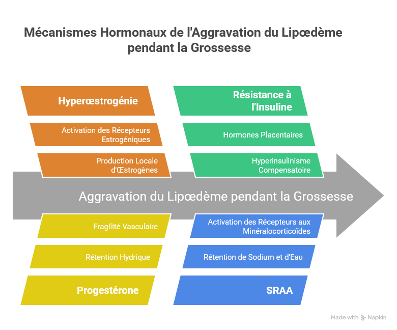 L’activation physiologique du SRAA pendant la grossesse entraîne une rétention de sodium et d’eau, contribuant à l’augmentation du volume plasmatique de 40 à 50 %. Chez les femmes lipœdémateuses, ce phénomène aggrave l’œdème interstitiel déjà présent dans les zones affectées, rendant les membres inférieurs particulièrement lourds et douloureux. La co-activation du SRAA et des récepteurs aux minéralocorticoïdes dans le tissu adipeux lipœdémateux constitue un mécanisme récemment identifié comme potentiellement impliqué dans la progression de la maladie [8].