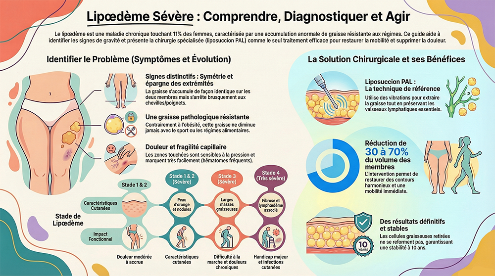 Le lipœdème sévère est une pathologie invalidante qui nécessite une prise en charge spécialisée. Ne laissez pas cette maladie altérer davantage votre qualité de vie. Si vous présentez des signes de lipœdème, notamment au stade sévère avec douleurs chroniques, limitations fonctionnelles ou échec des traitements conservateurs, il est temps de consulter.
