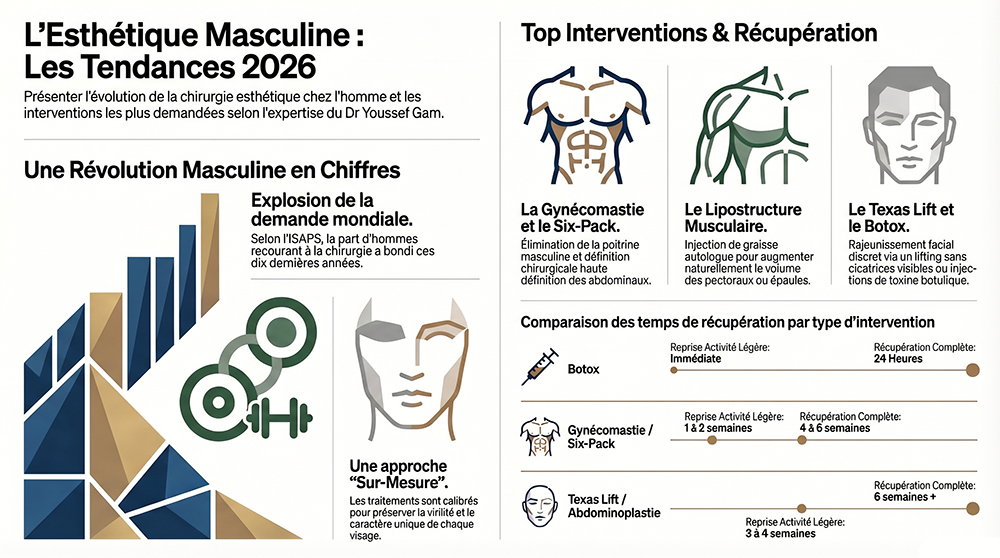 Cette évolution s’explique par plusieurs facteurs : la déstigmatisation progressive du soin de soi chez l’homme, l’essor des réseaux sociaux qui valorisent l’apparence physique, l’influence de la culture du fitness, et la démocratisation des techniques moins invasives qui réduisent le temps de récupération. Le Dr Youssef Gam accompagne cette transformation avec une approche sur mesure, fondée sur l’écoute, la discrétion et un souci du résultat naturel.